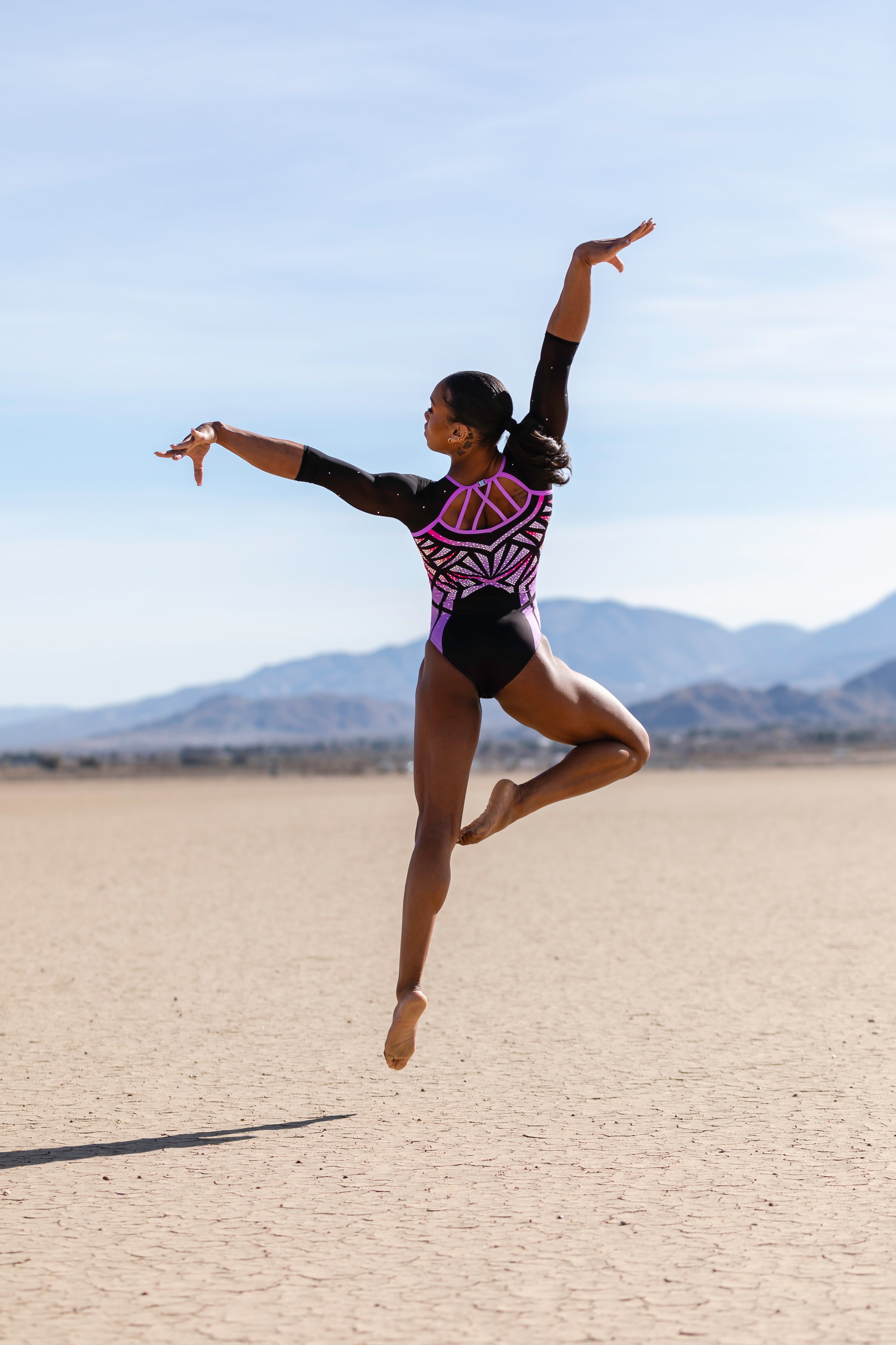 Crafted to make a bold & impactful statement—the Nylah design gives a dose of main character energy on the floor. The sublimated print design cocoons the body, wrapping it in colour from any angle, with engineered angular line work and an ombre design that flows from top to bottom. Styled in a higher round neckline with clasp at the back neck, small V-shaped keyhole & delicate criss-cross straps ensuring complete compliance. The crystal detailing is super rich and hyper shiny, matching the print design in AB stones and sleeve scatter. Embellished with crystals by Swarovski®.