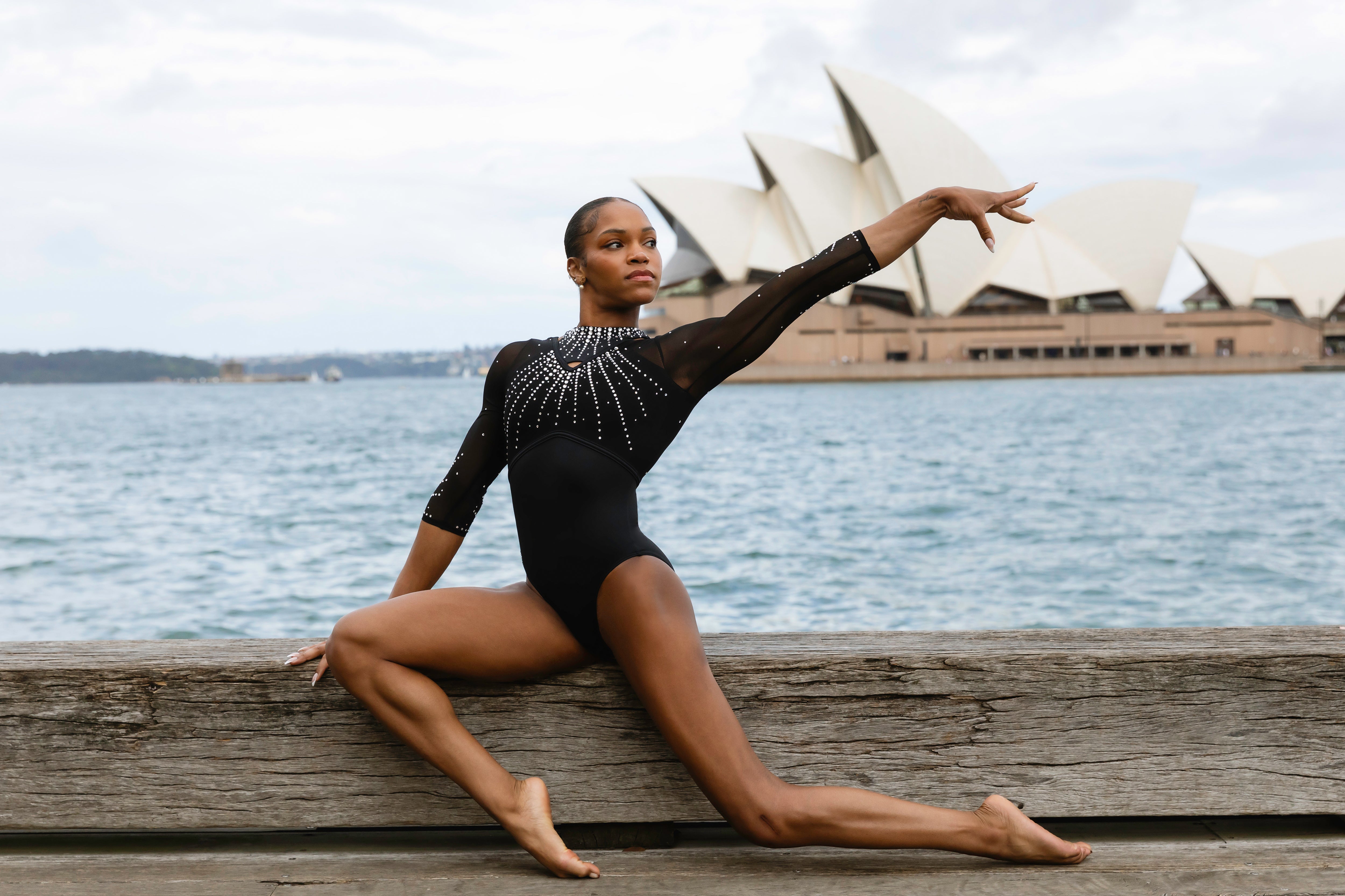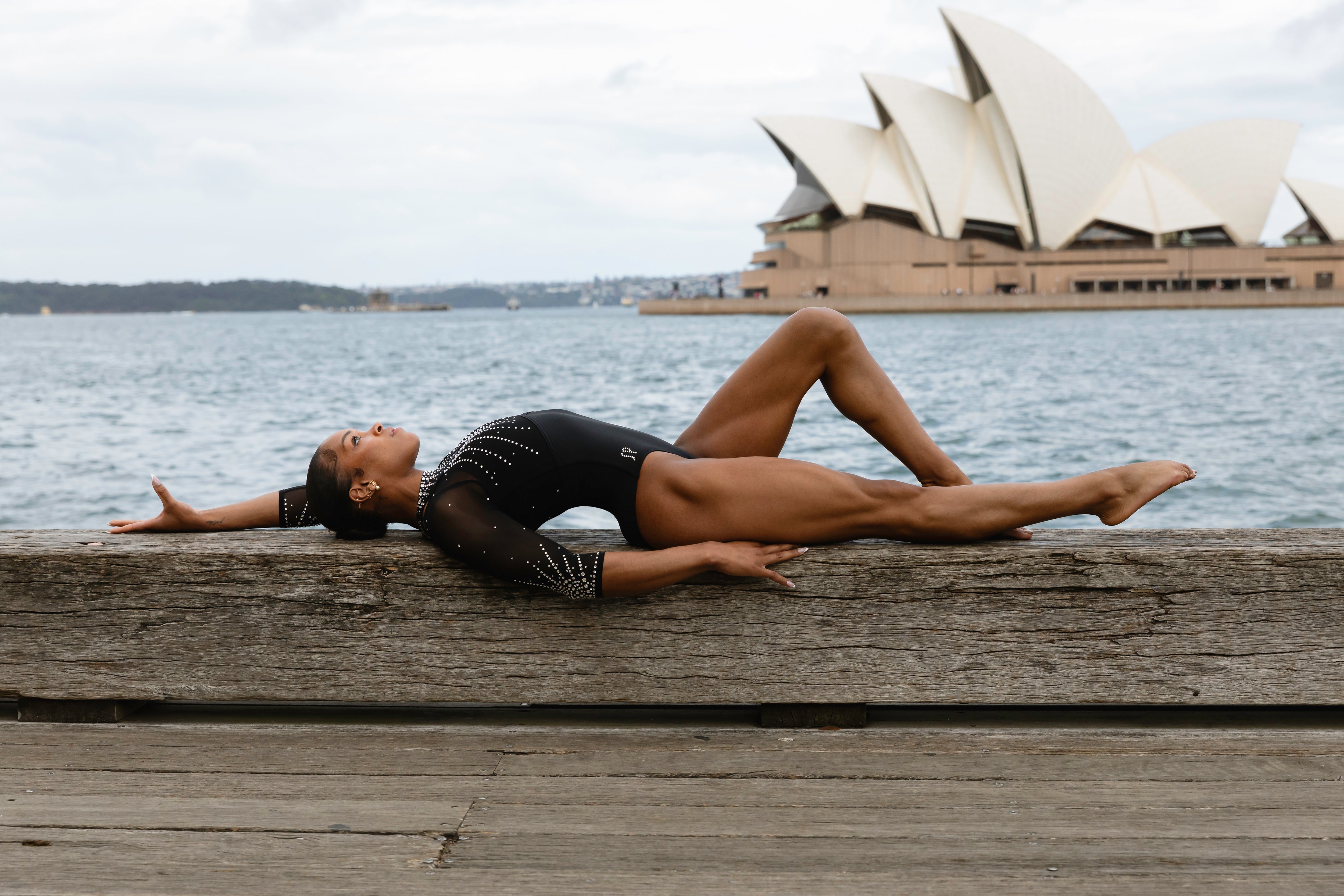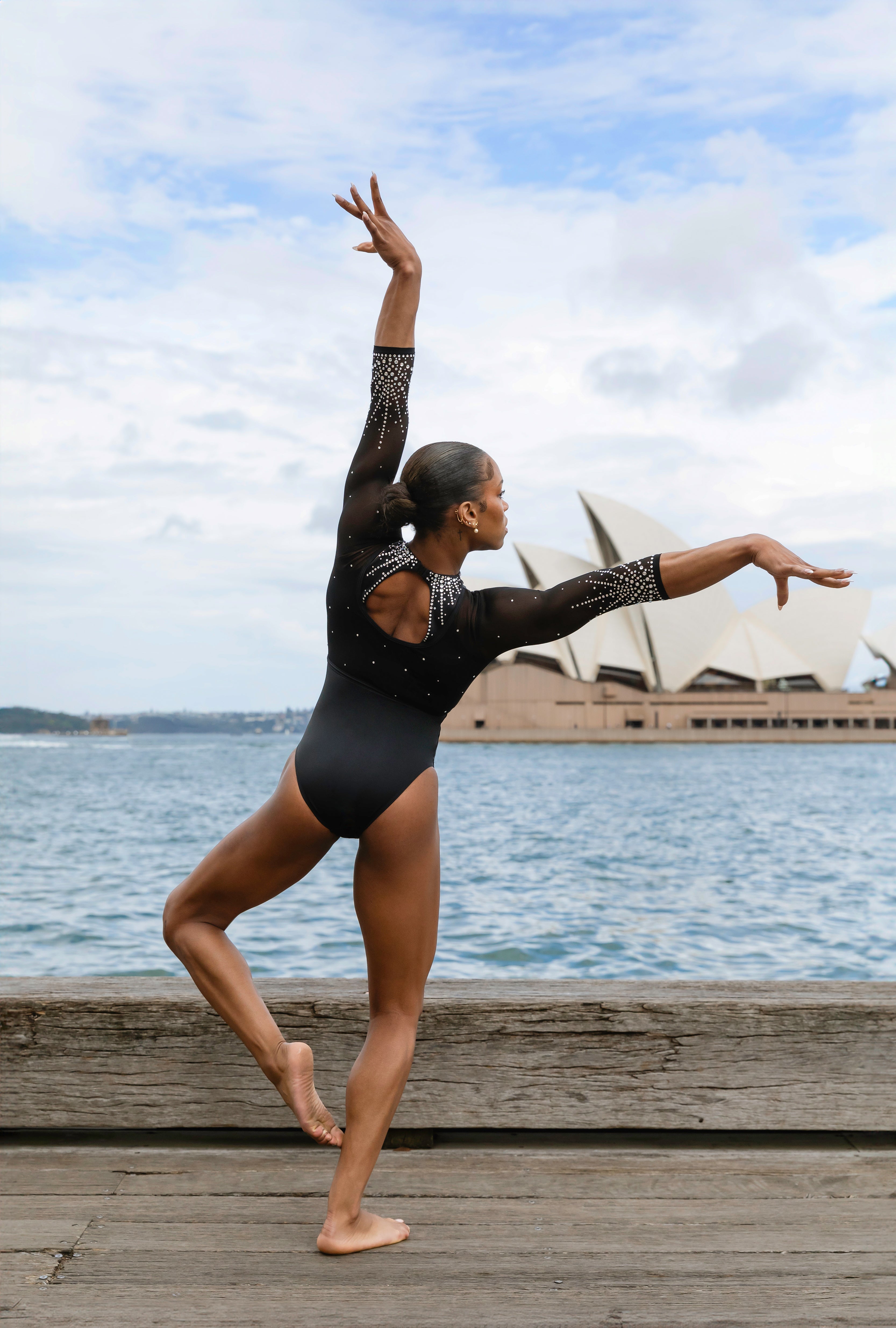 Inspired by Shilese Jones's Fearless competition leotard from 2024. The Aisha design shows how our design intelligence is unmatched. A uniquely original double layered-look neckline with cut-outs shows off-shaped bodice panelling.
