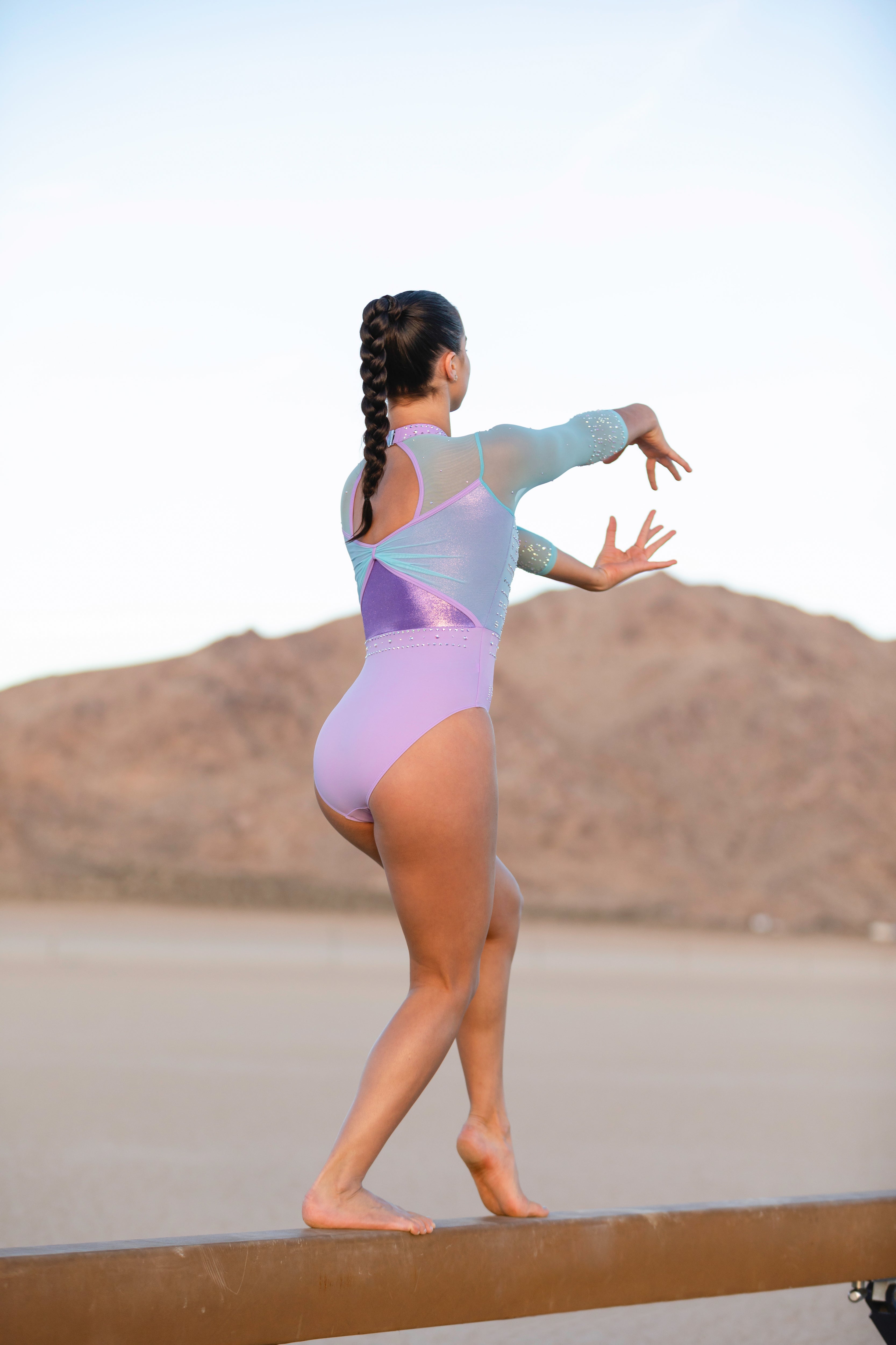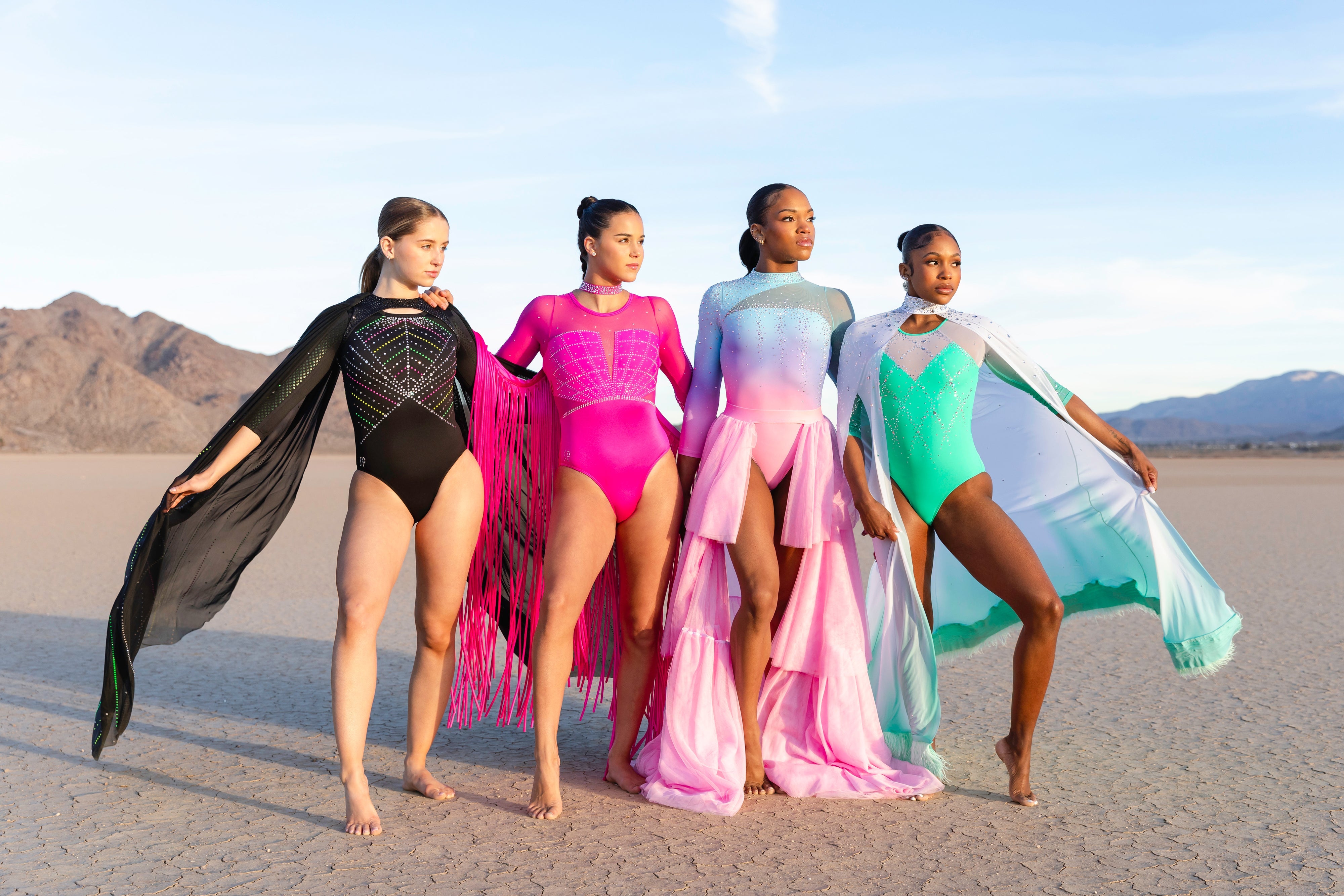 High fashion and editorial—the Shi leotard was inspired by Shilese Jones’s 2023 Championships look of the same design. Styled in a high neck with a neckband and clasp at the back, the asymmetric design flows with the body. Angled mesh panelling combines with a curved keyhole back and a one-shoulder design. Sleeves are cut from textural fabrications, one matt lycra and one mesh. The all-over freeform ombre is eye-catching and femme. The AB-coloured stones are the showstopping hero, with heavy scattering through the neck and shoulder, expanding to delicate icicles through the bodice. Embellished with crystals by Swarovski®.