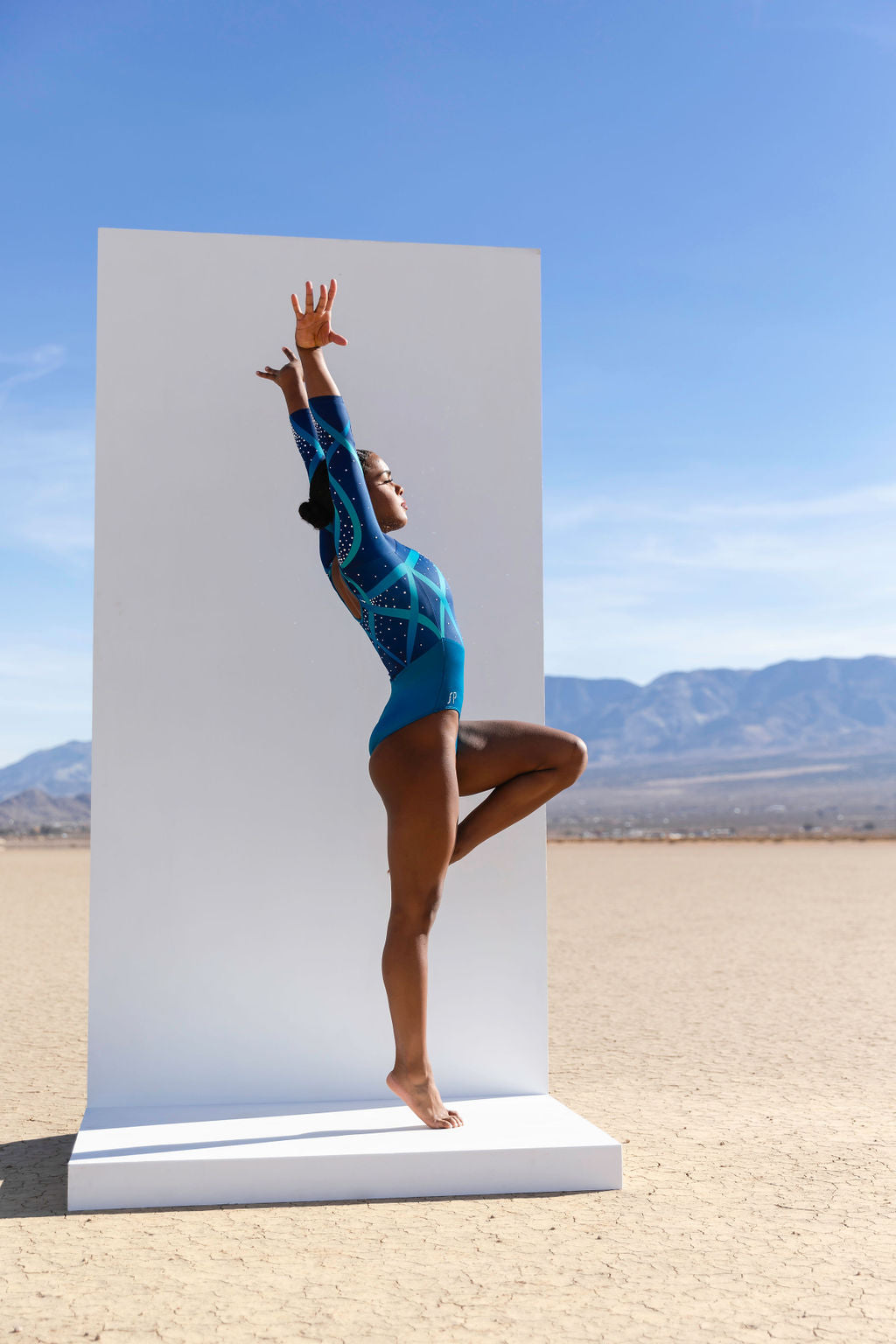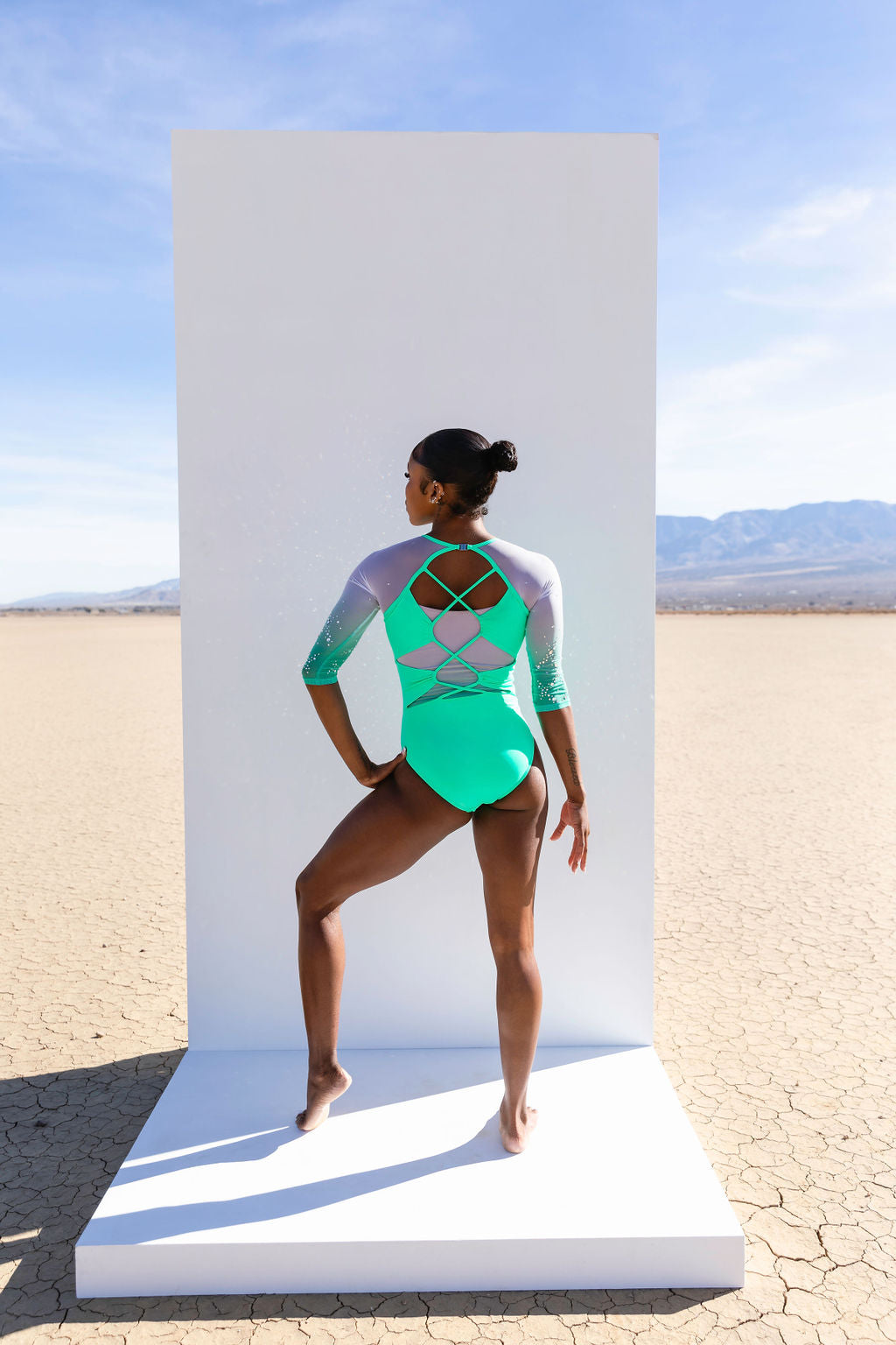 Design mastery at its finest – the Charla leo is a double-layered look and a signature editorial teamwear style, ready to stand out on the floor. Styled in a V-shape halter neck outer layer with a round mesh underlay through the front. A clasp at the back neck allows ease of movement with one-of-a-kind cut-outs and strap detailing. A straight belt detail in mystique draws the eye. Clear crystals are delicate yet magnificent, with pear, kite and navette shapes adding to the grandeur of the couture look. Embellished with crystals by Swarovski®.