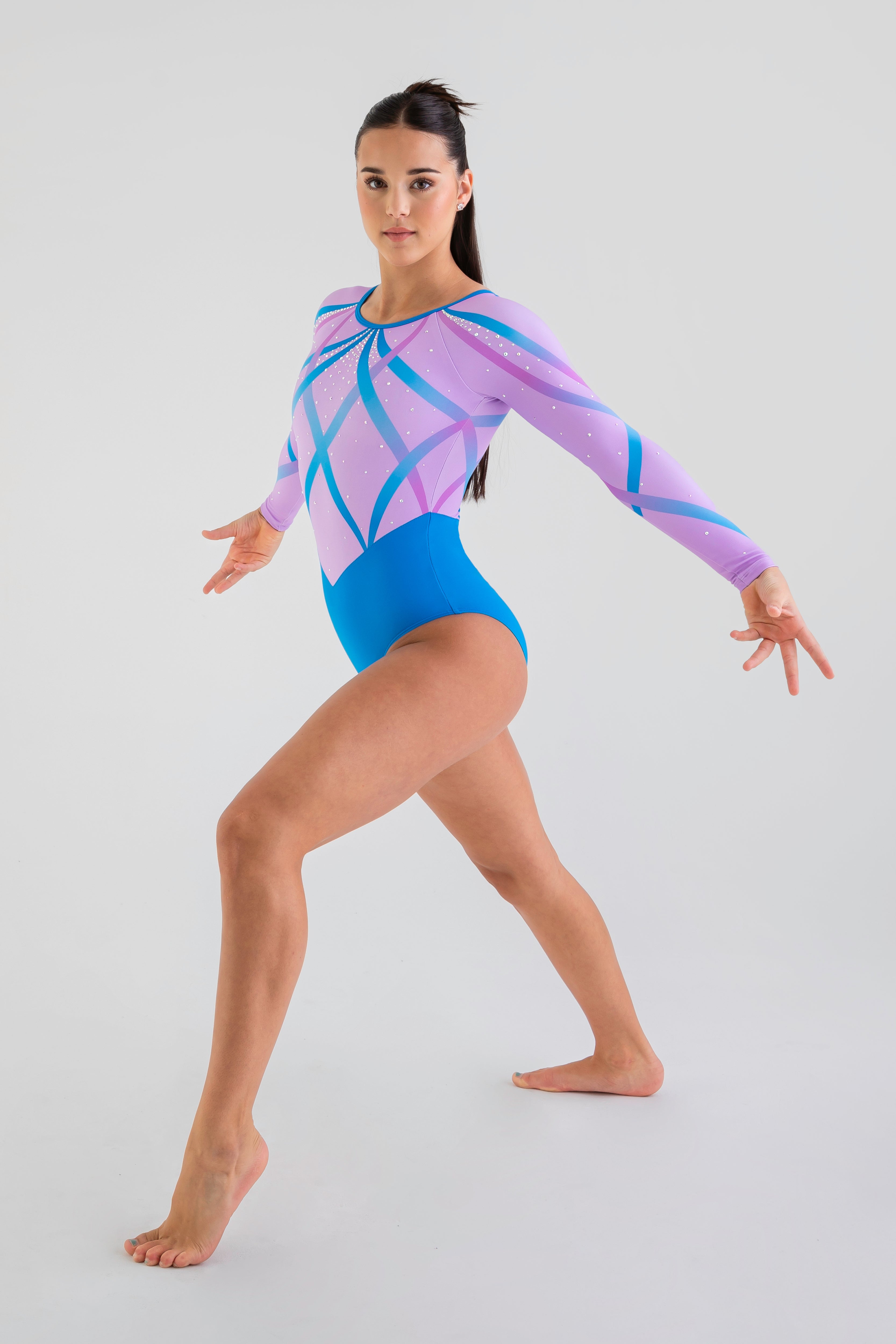 A playful look, inspired by rhythmic gymnastics – the Kenzi design dares to be different. Styled in a round neckline at the front with a V-shape at the back. The upper bodice and sleeves are sublimated with an ombre ribbon-like look.