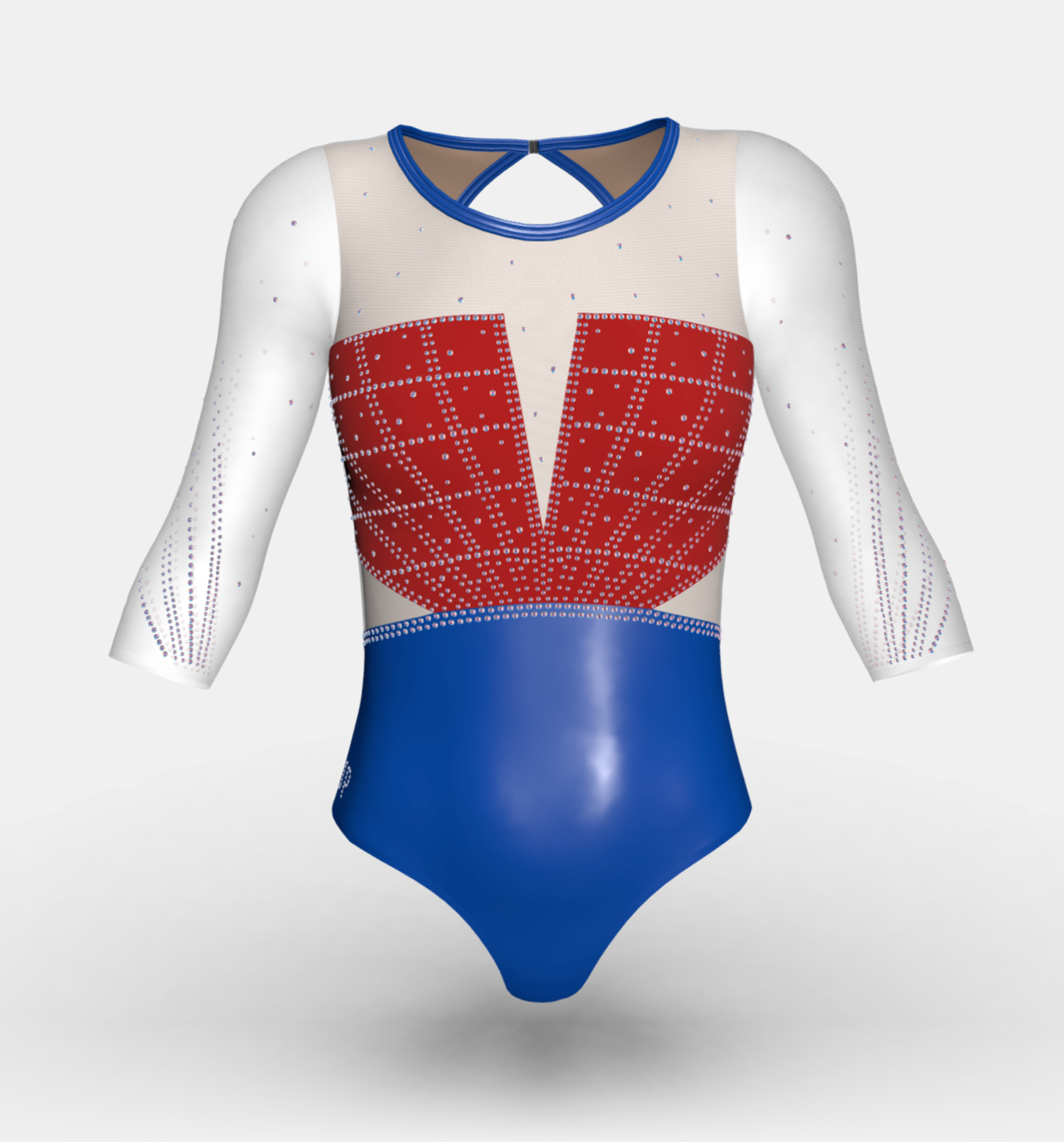 Named after one of our most experienced sewers on the production team—the Kerri design exudes high-fashion elegance on the gymnastics floor. Styled in a higher round neckline with clasp at the back, a deep V-shaped sweetheart adorns the front with side mesh cutouts.
