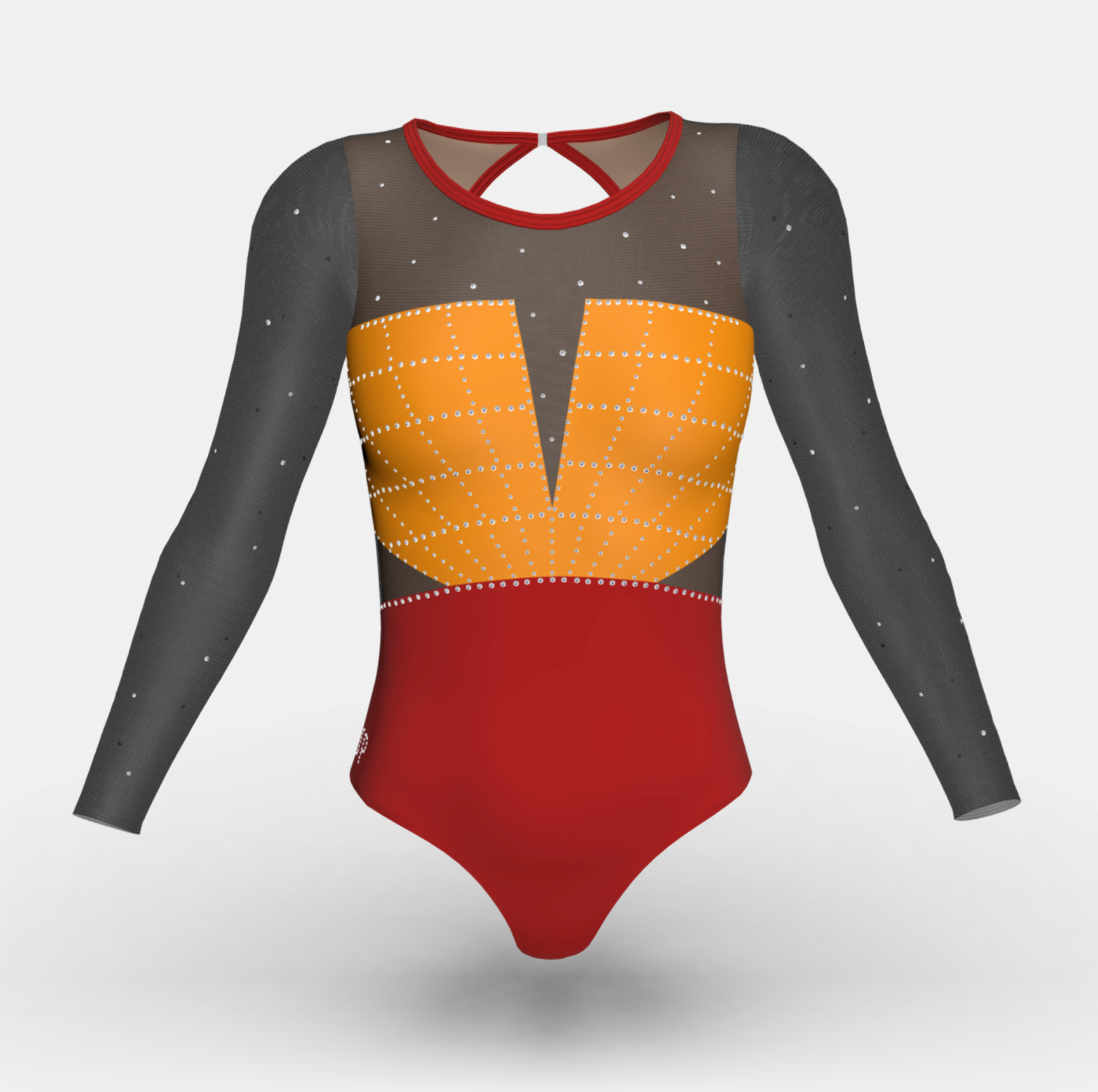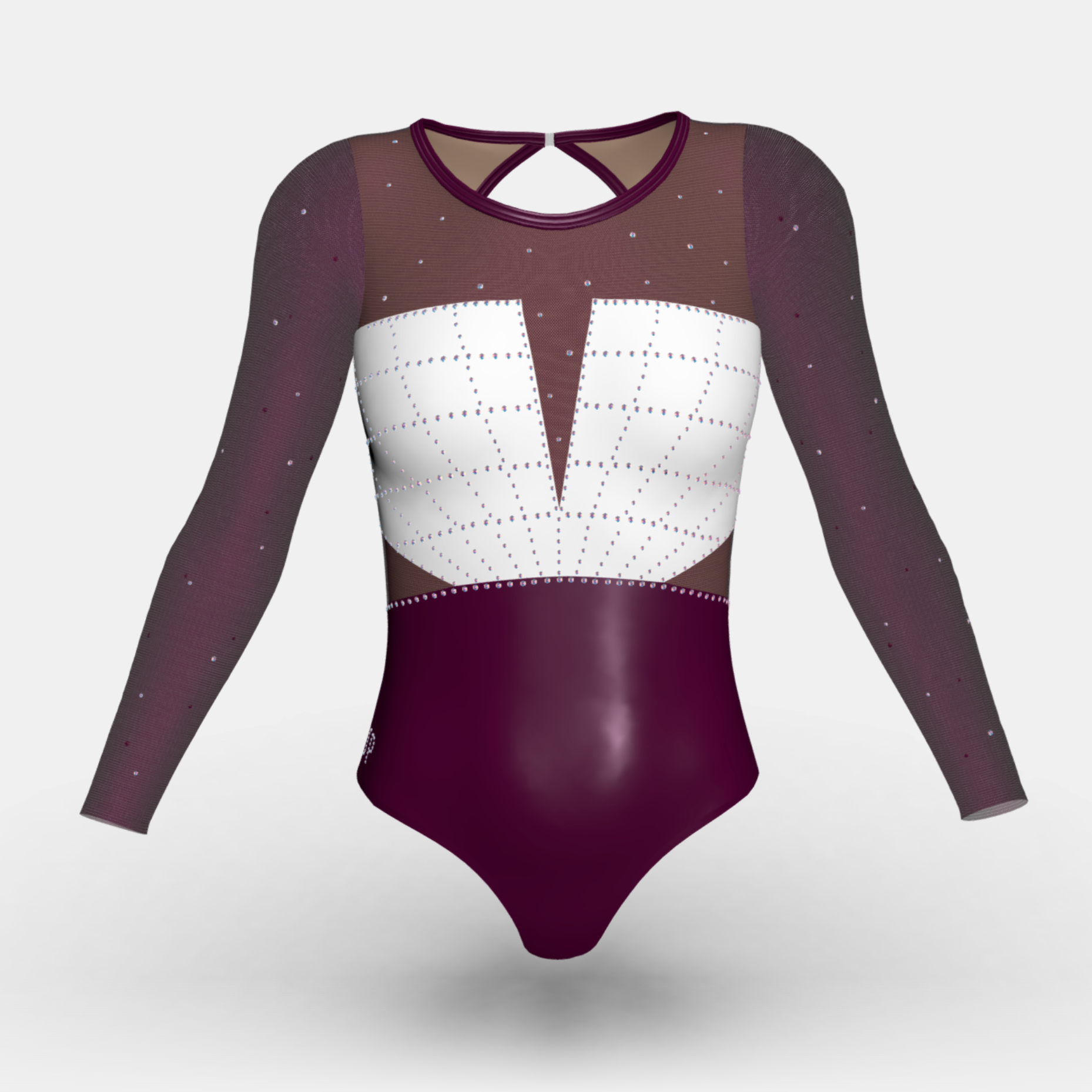 Named after one of our most experienced sewers on the production team—the Kerri design exudes high-fashion elegance on the gymnastics floor. Styled in a higher round neckline with clasp at the back, a deep V-shaped sweetheart adorns the front with side mesh cutouts.