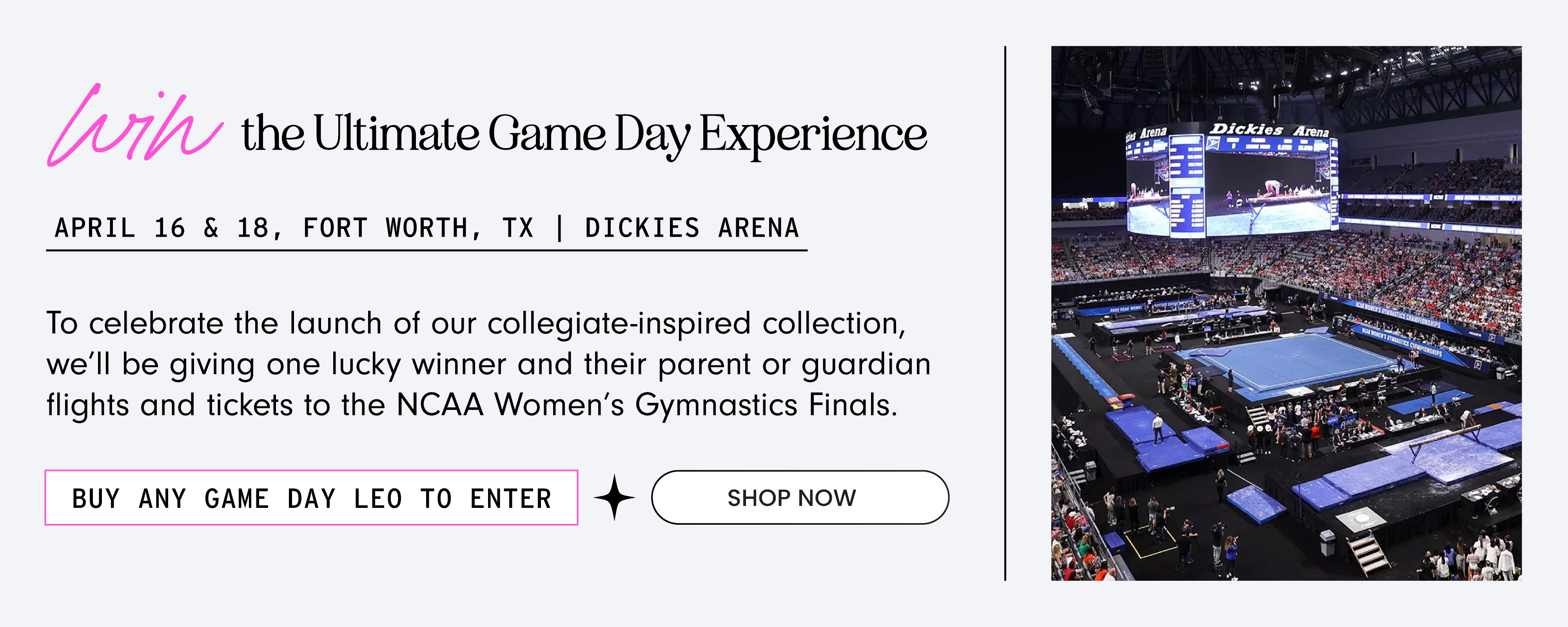 We are giving one lucky winner and a parent or guardian flights and tickets to the NCAA Women's Gymnastics Finals in Fort Worth, Texas!
