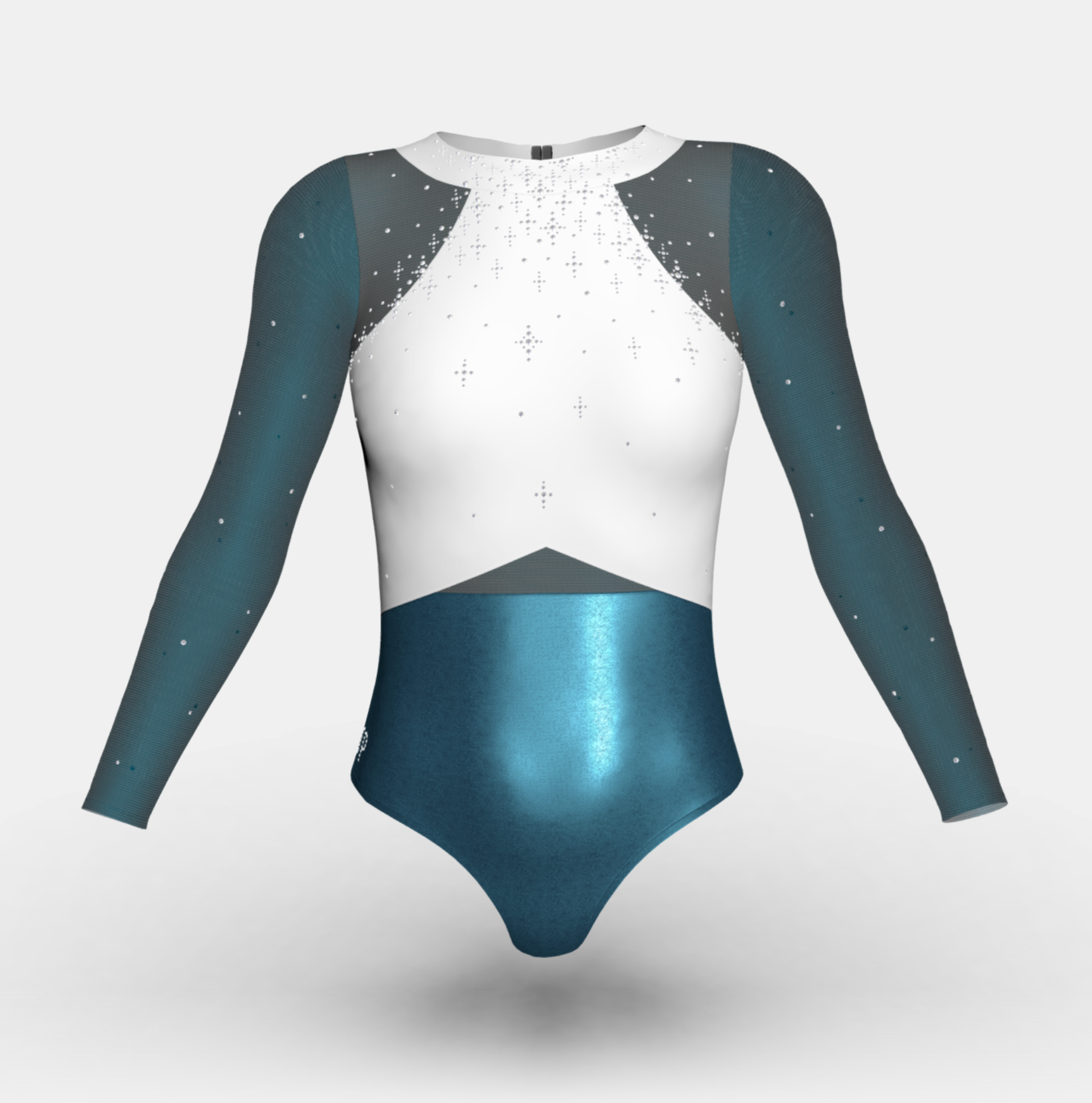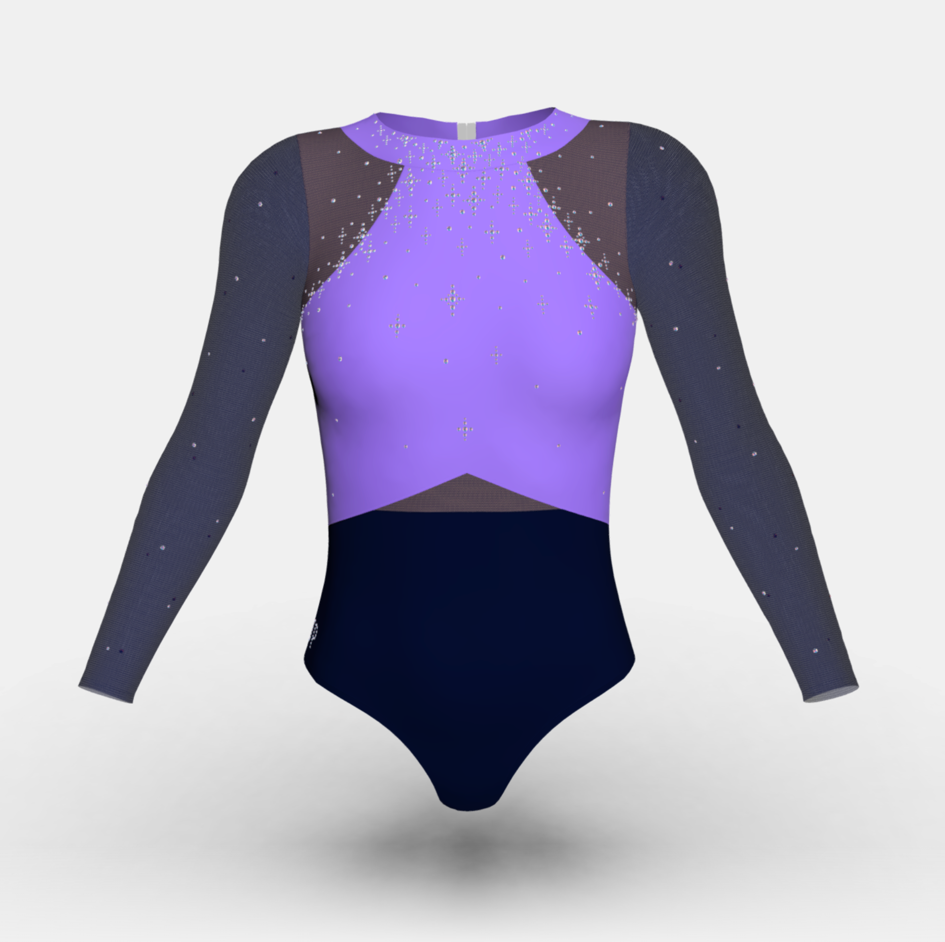 Mystical and opulent—the Omari design has been inspired by the night sky, forever sparkling. Styled in a new high neckline with a set-in neckband for athlete comfort and clasp at the back neck for easy movement on the floor.