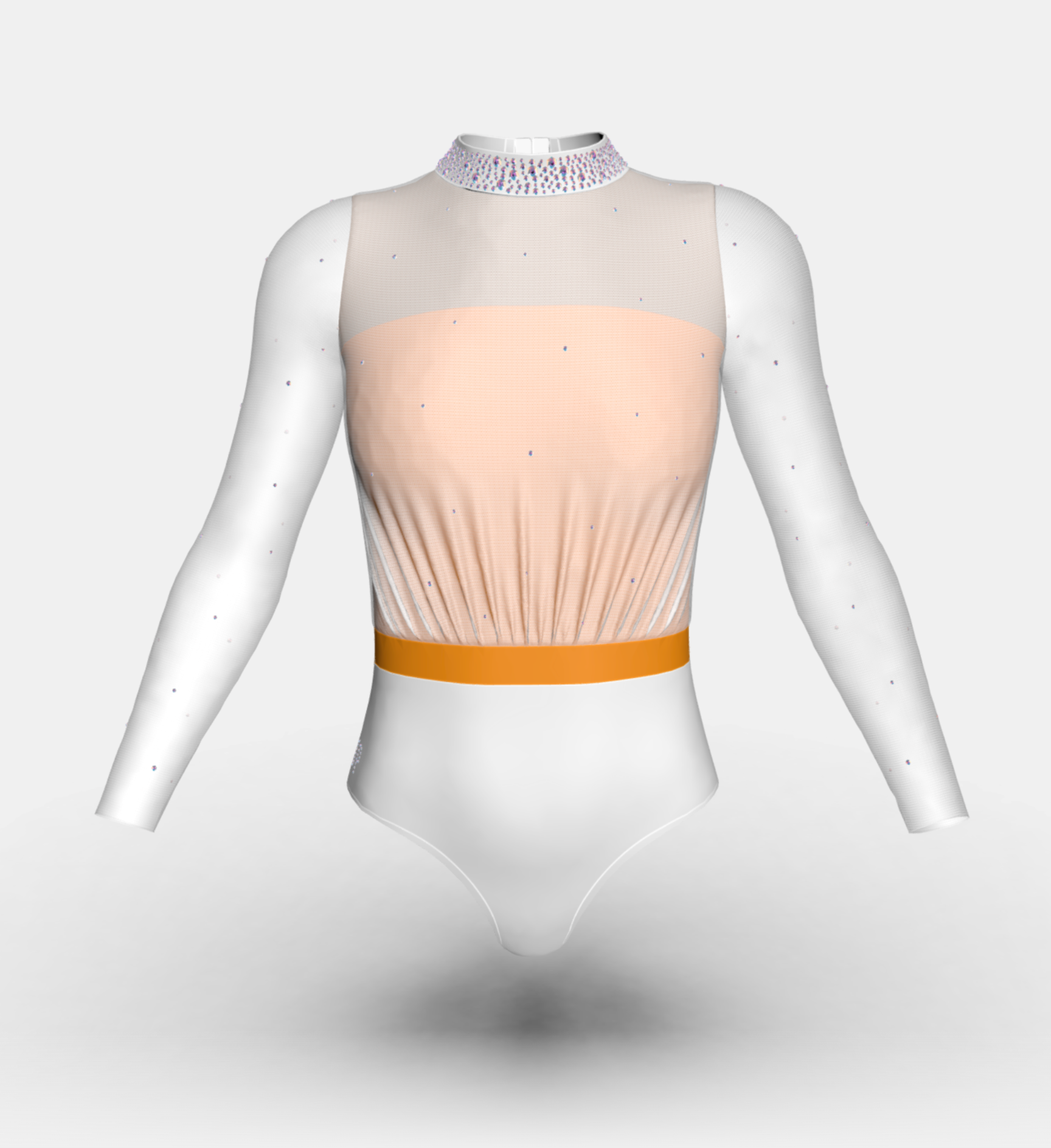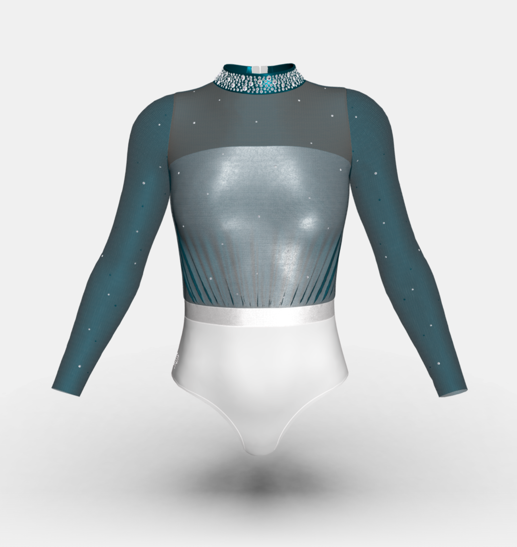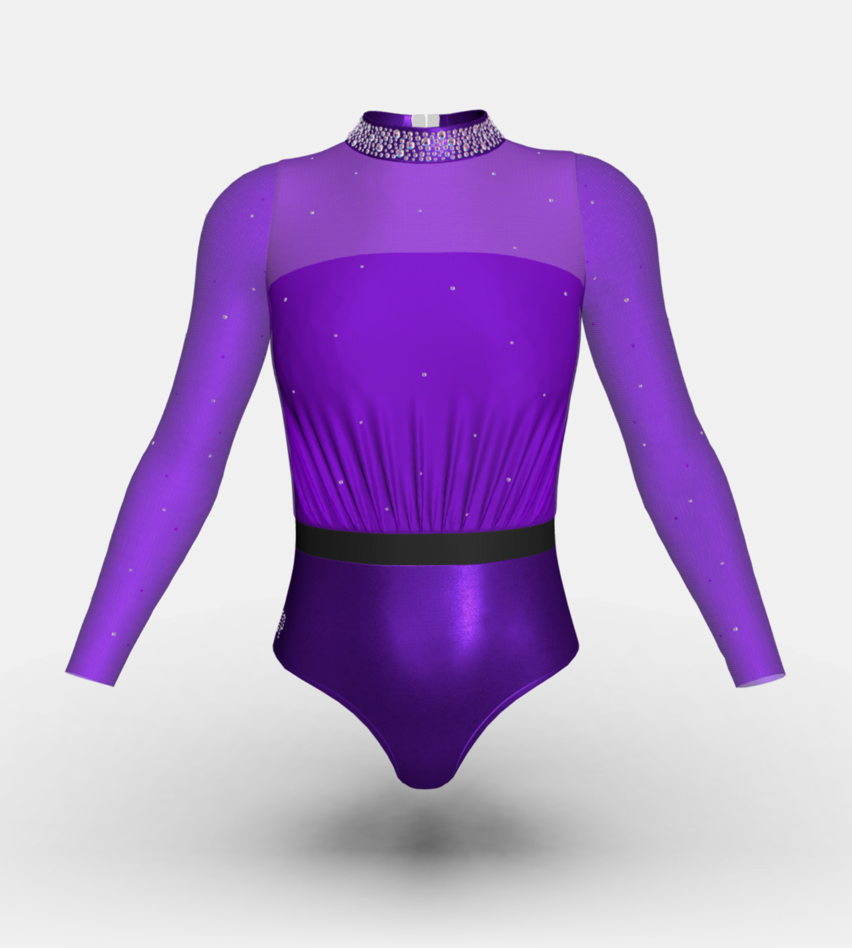 Awe-inspiring, mysterious, and fascinating. The Thea design has all the elements of a showstopping design. Featuring a gathered mesh overlay through the front with a mystique underlay and belt for a subtle sheen. Clasp at the back neck for ease. Front and back upper panels are skin lined for complete coverage. Elegant crystals adorn the neck band with a light scatter across the chest and sleeves for a subtle sparkle. For that extra touch, there is an intricate crisscross strap detail through the back. The lower body has been crafted from a wetlook fabrication only available in select colors.